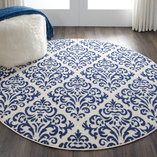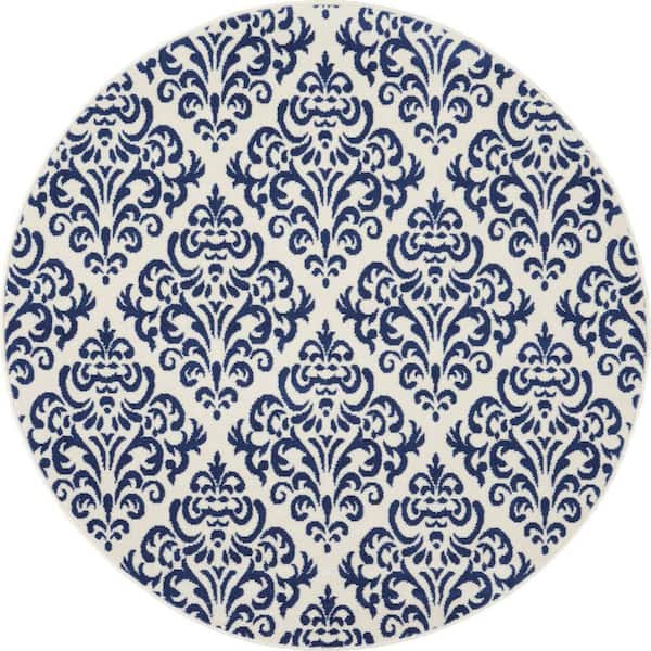 Grafix White/Blue 5 ft. x 5 ft. Persian Geometric Transitional Round Area Rug