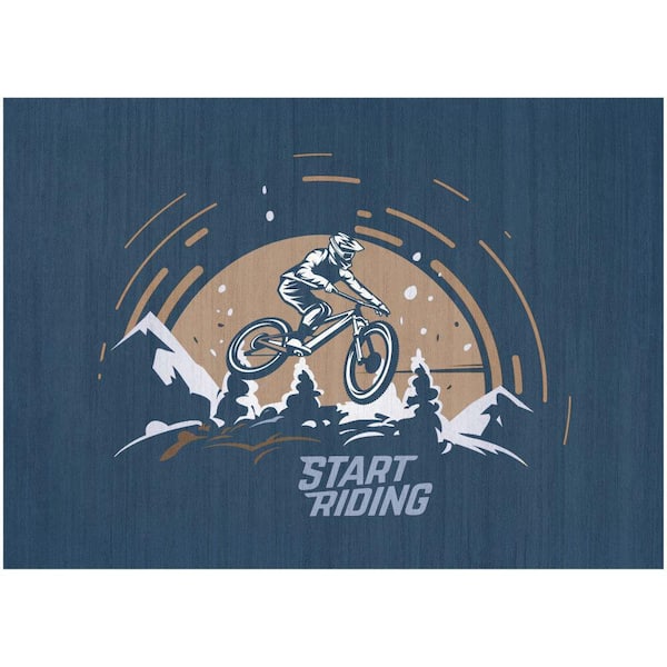 • Printed kids’ rug features a dynamic mountain biking scene