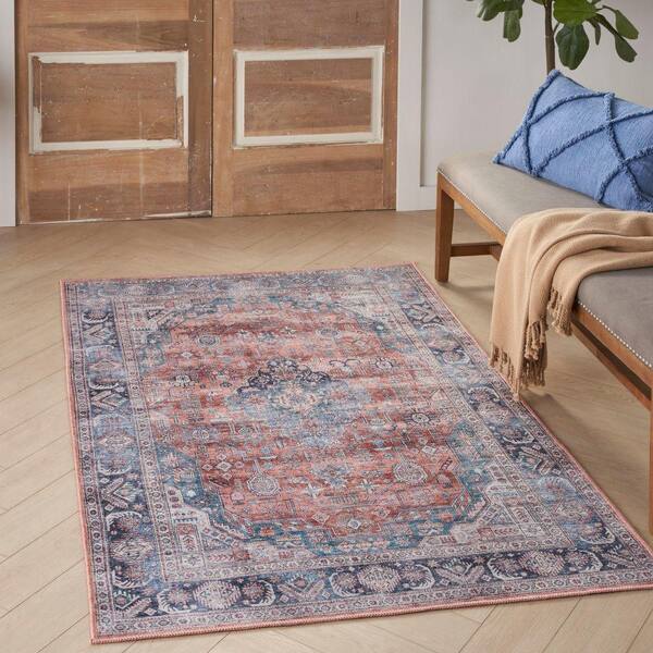 Machine Washable Brilliance Blue/Multi 4 ft. x 6 ft. Center Medallion Traditional Area Rug