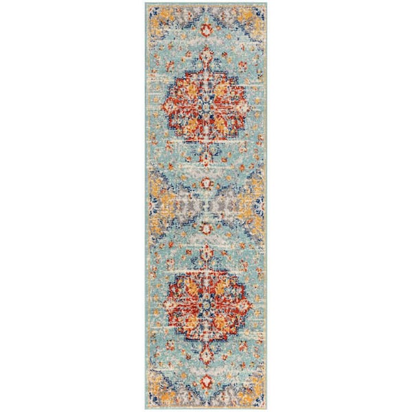 Passion Aqua Multicolor 2 ft. x 6 ft. Center medallion Traditional Runner Area Rug