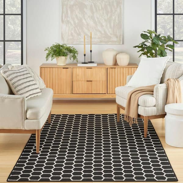 Reversible Indoor Outdoor Black 5 ft. x 7 ft. Honeycomb Contemporary Area Rug