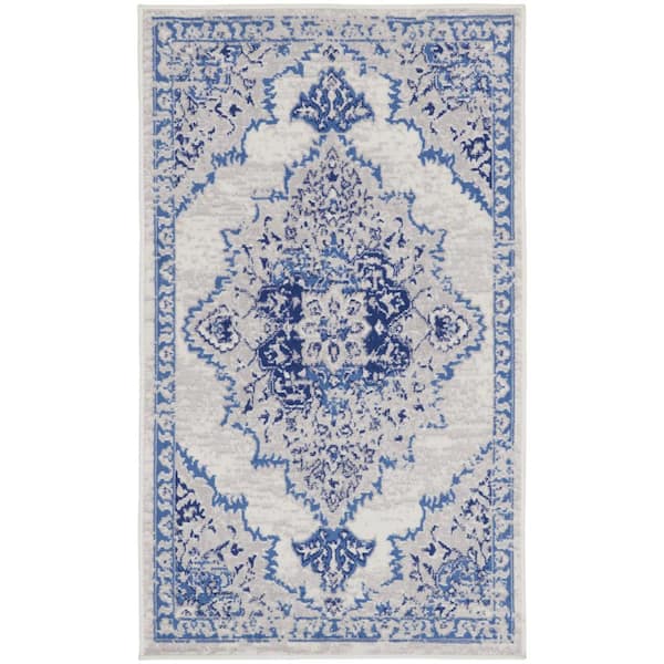Whimsical Ivory Blue 3 ft. x 5 ft. Center Medallion Traditional Kitchen Area Rug