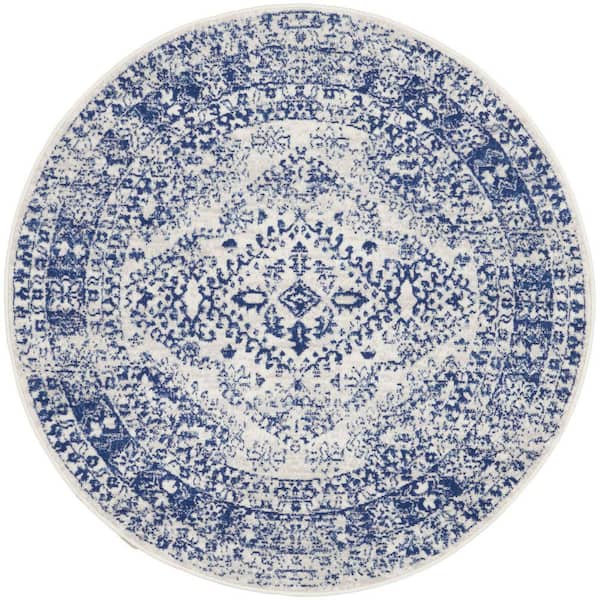 • Ivory navy polypropylene round rug with 2/5 in. thickness