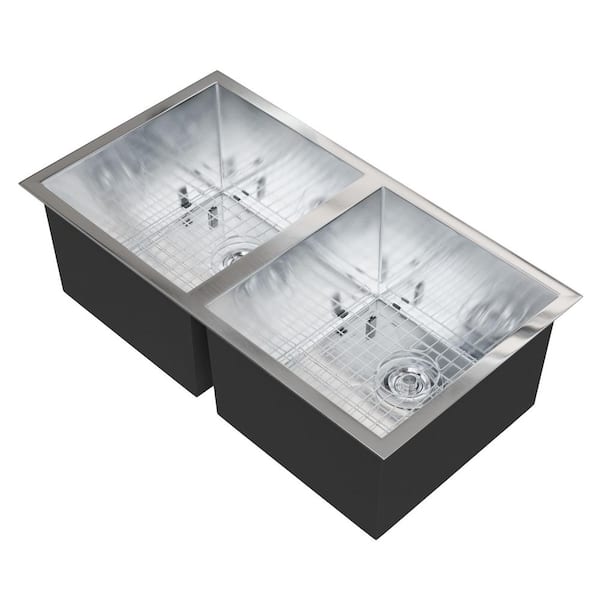 Zero Radius 33 in. Drop-In/Undermount Double Bowl 18-Gauge Stainless Steel Kitchen Sink with Drain and Bottom Grid Kits