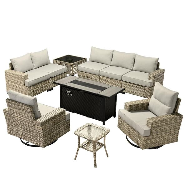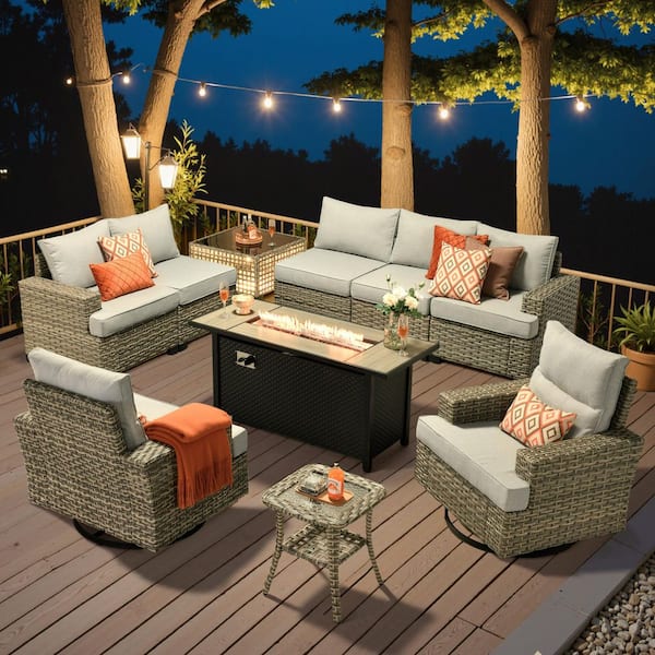 Novique 10-Pieces Wicker Rectangular Fire Pit Sets and Swivel Rocking Chairs with Grey Cushion