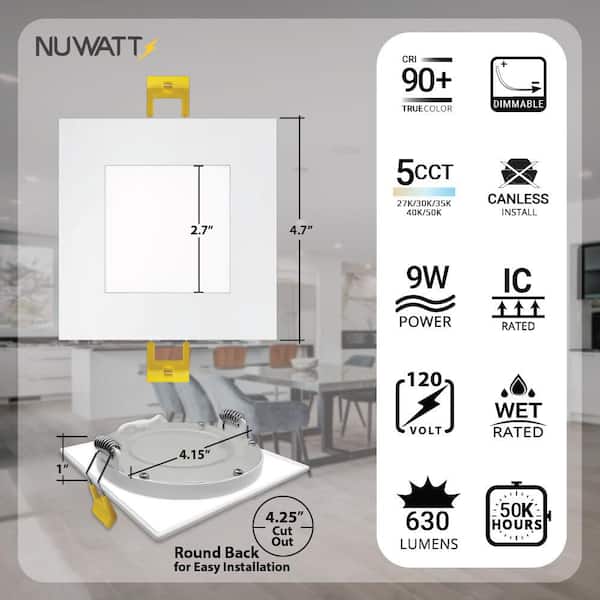4 in. White Square Slim Canless Integrated LED Recessed Light Kit 5 Color Selectable 2700K to 5000K Dimmable (6-Pack)