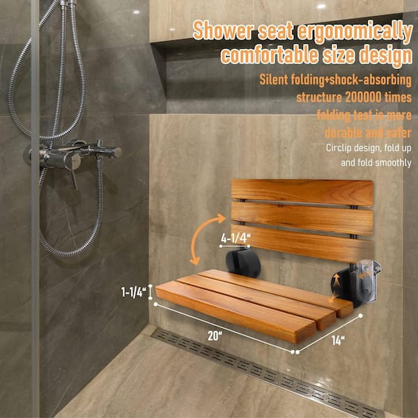 20 in. Wall Mounted Folding Teak Shower Seat in Black and Yellow, Fold Down Shower Bench, Teak Wood Stool