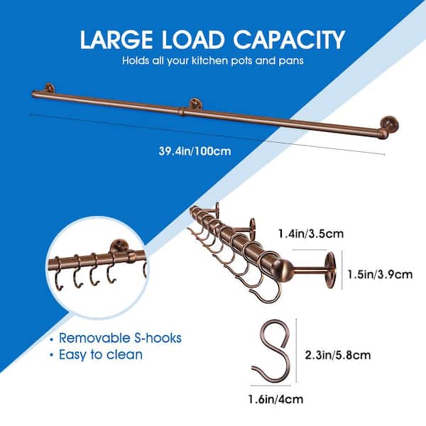 39.4 in. Antique Copper Stainless Steel Wall Mounted Pot Rack, Hanging Pot and Pan Rack with S Hooks for Kitchen
