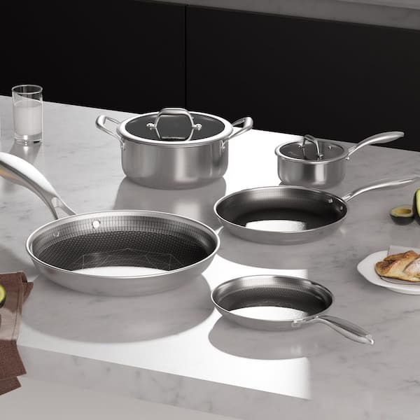 7-Piece Silver Nonstick Stainless Steel Cookware Set with Glass Lid, Hybrid Ceramic Cookware, Etching Technology