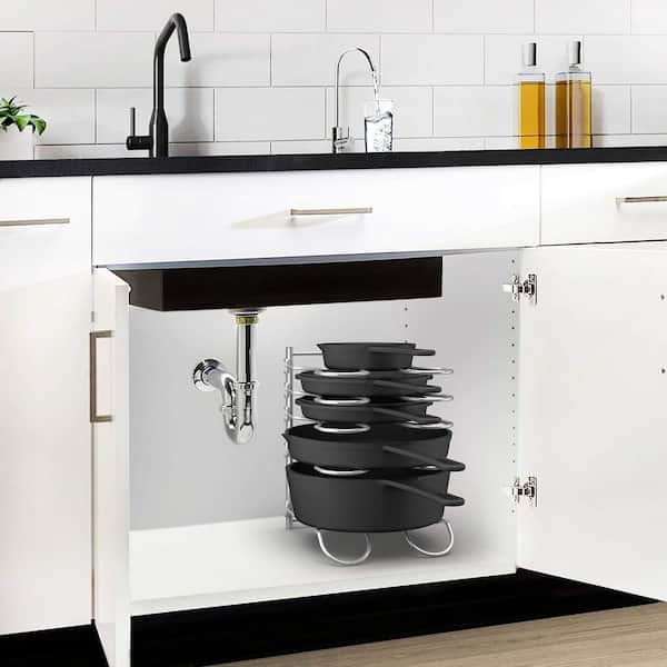 Adjustable Chrome Tiered Shelf Pot Rack, Black Pan Rack, Cookware Organizer Rack Holder with 5 Adjustable Dividers