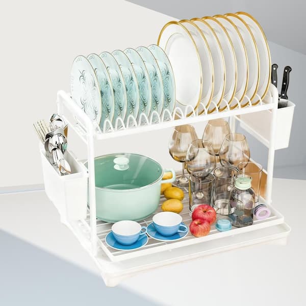 Basic Series, 2-Tier Large Capacity Metal Dish Rack, Storage Rack with Cutlery Holder, in White