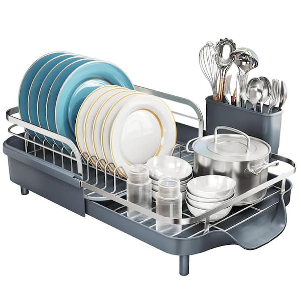 Gray Dish Drying Rack, Stainless Steel Rustproof Dish Rack, with Detachable Utensil Holder for Small Kitchen Countertop