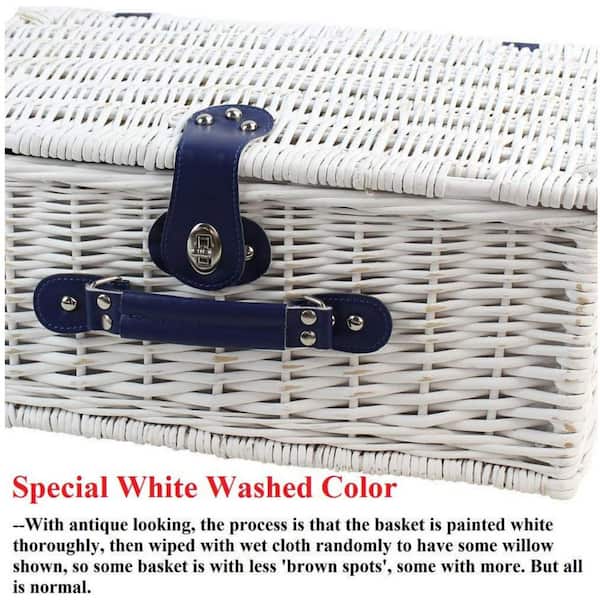White Wicker Picnic Basket with Insulated Cooler Compartment, Waterproof Blanket and Cutlery Service Kit for 4-Person