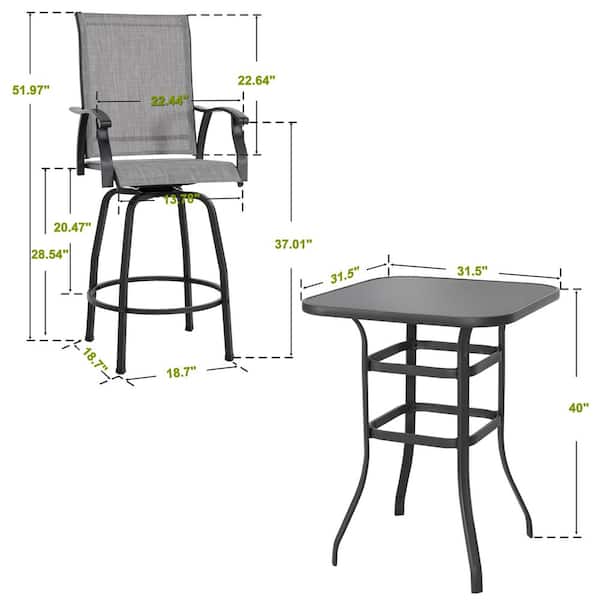 • Includes 1 patio bar table and 2 bar stools, 360-degree swivel