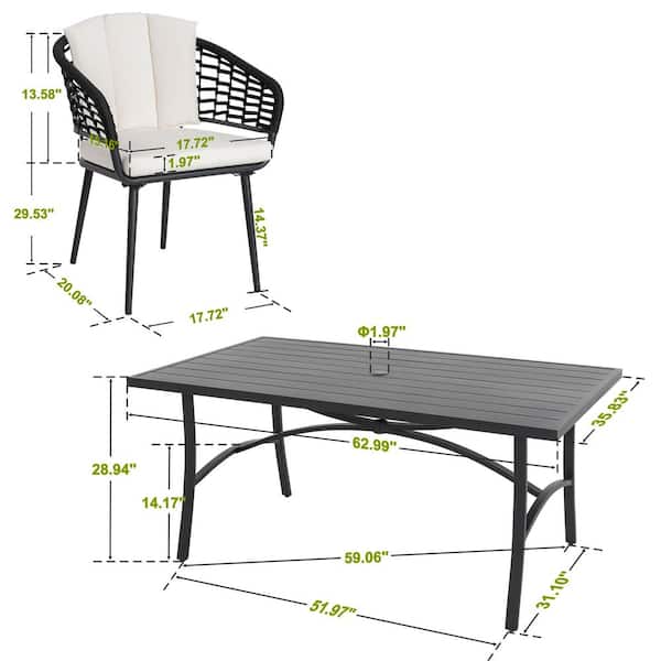Black 7-Piece Rope Aluminum Outdoor Dining Set with 1.97 in. Umbrella Hole and 1.97 in. Thick Beige Cushions