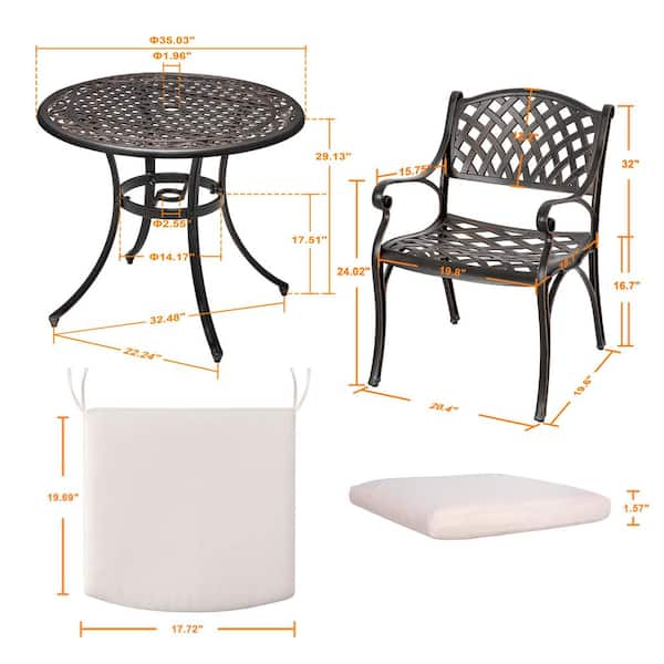 • Includes 2 cast aluminum chairs and 1 table with an umbrella hole