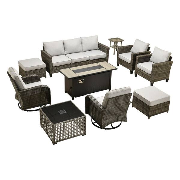 Nvelyn Gray 10-Piece Wicker Patio Rectangle Fire Pit Conversation Set with Gray Cushions and Swivel Chairs