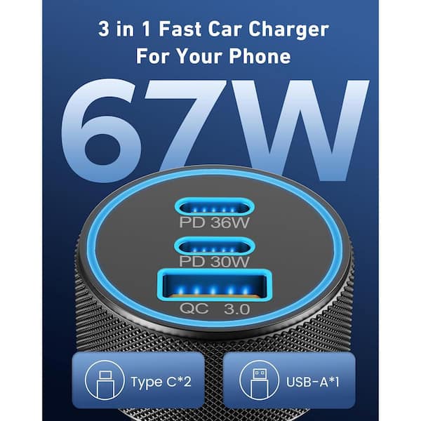 67W 3-Port Fast Type C Car Charger USB C PD/QC Adapter Samsung Galaxy and iPhone 16/15 Pro Max plus 3 ft. USB-C Cable