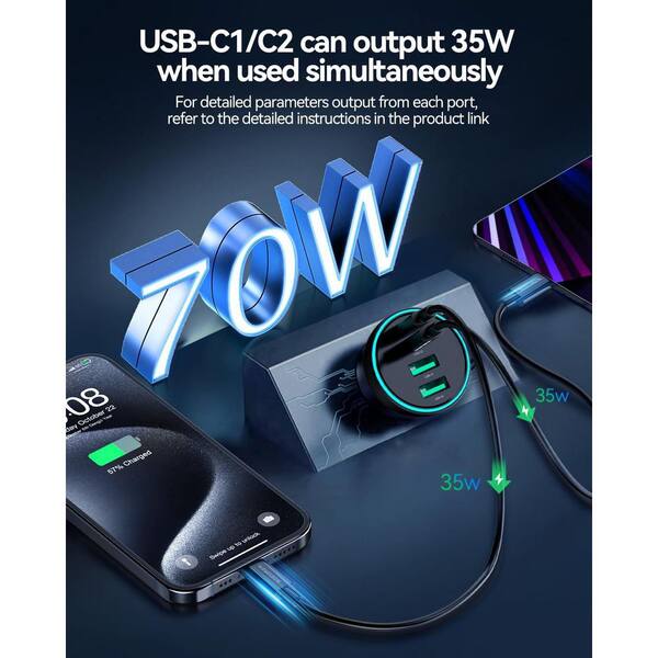 72W USB C Car Port Adapter with 36W Coiled Cable for iPhone 16 Pro Max Plus Samsung Galaxy Android Devices in Black