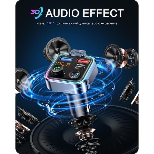 Bluetooth 5.3 FM Transmitter Radio Adapter Car with Type-C Port PD 30W QC3.0 Audio Stereo MP3 Player & 7-Color LED Light