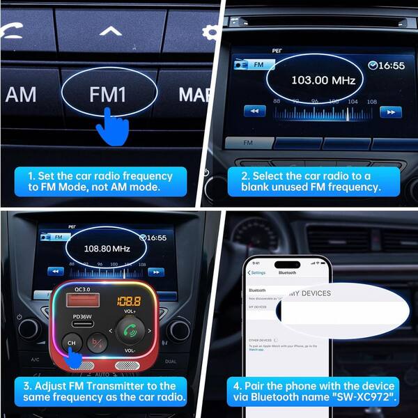 Bluetooth 5.4 FM Transmitter Car Adapter 54W PD 36-Watt &18-Watt Dual Mics HiFi Bass Sound Fast Charging LED Display Red