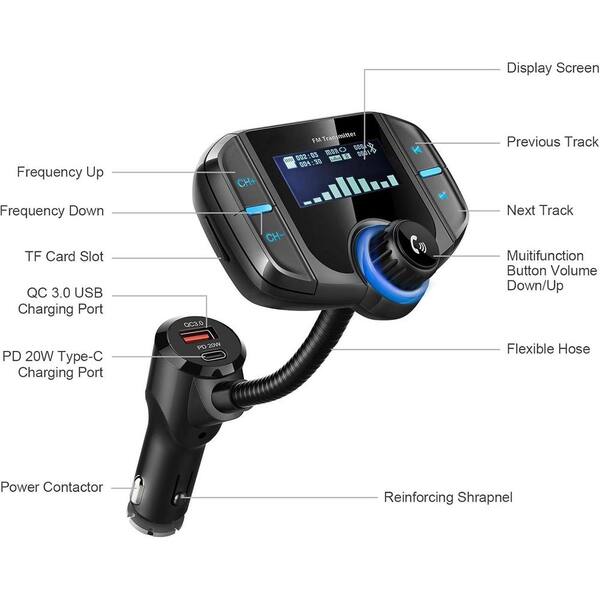 Bluetooth FM Transmitter Wireless Radio Adapter Hands Free Car Kit with Display Dual USB Ports Black