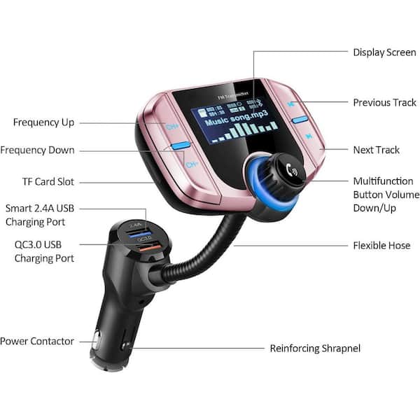 Upgraded Bluetooth FM Transmitter Wireless Radio Adapter Hands Free Car Kit 1.7 in. Display Rose Gold