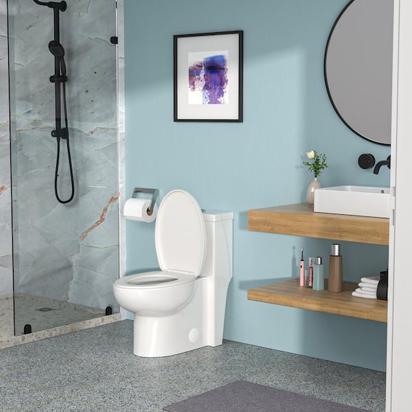 12 in. 1-Piece 1.6/1.1 GPF Dual Flush Elongated Toilet in White-7 with Slow-Drop Cover and Top Press