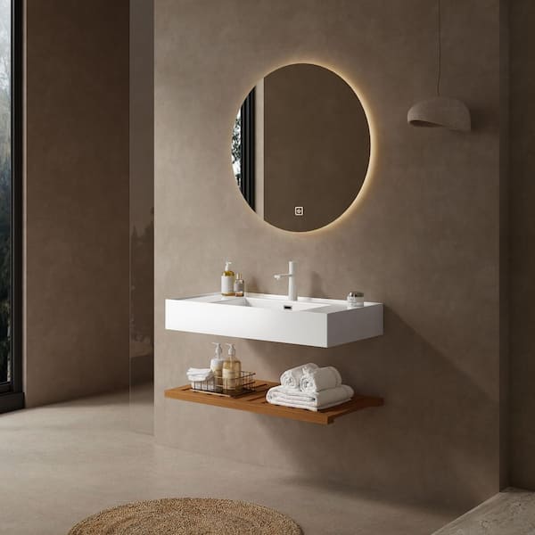 36 in. Wall-Mounted Rectangular Acrylic Bathroom Sink in White with One Walnut Striped Shelves Layer