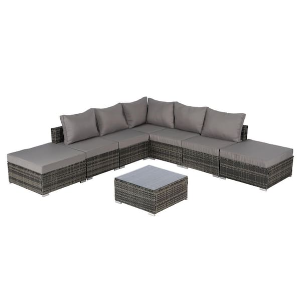 8-Piece Wicker Outdoor Sectional Sofa Set with Dark Gray Cushions, Coffee Table and Ottoman