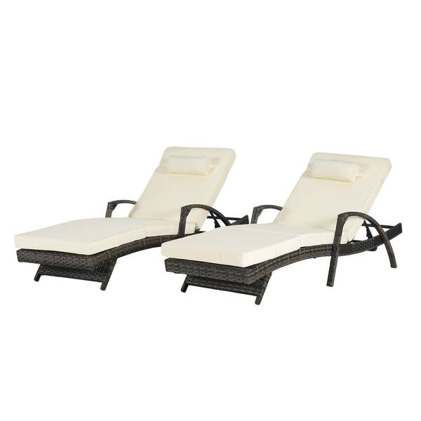Brown Wicker Outdoor Chaise Lounge with Beige Cushions, Armrest and Adjustale Backrest (Set-2)