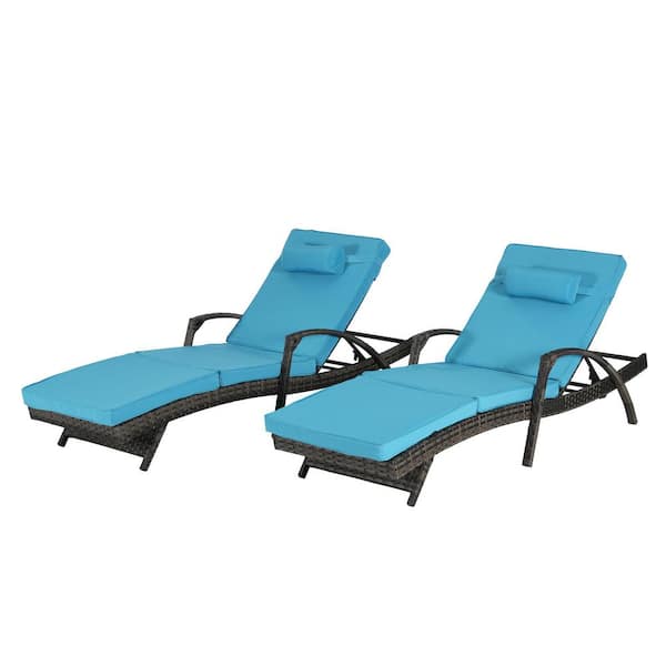 Brown Wicker Outdoor Chaise Lounge with Light Blue Cushions, Armrest and Adjustale Backrest(Set-2)