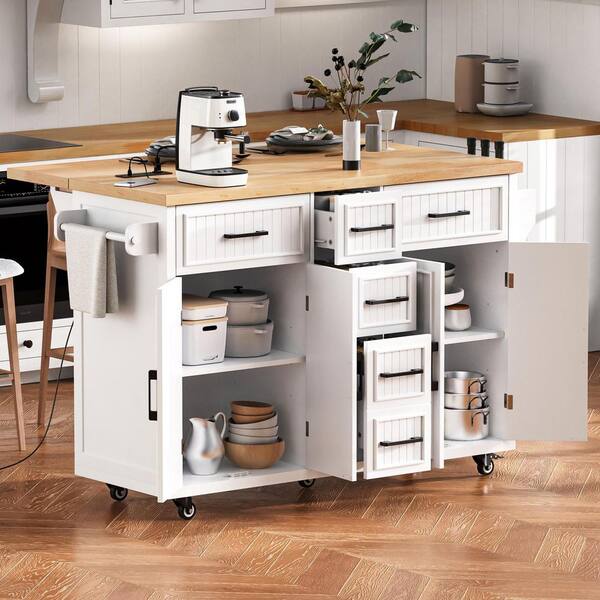 White Wood 56.5 in. W Embossed Vertical Stripe Rolling Kitchen Island with Drop Leaf, 5 Deep Drawers and 4 Doors