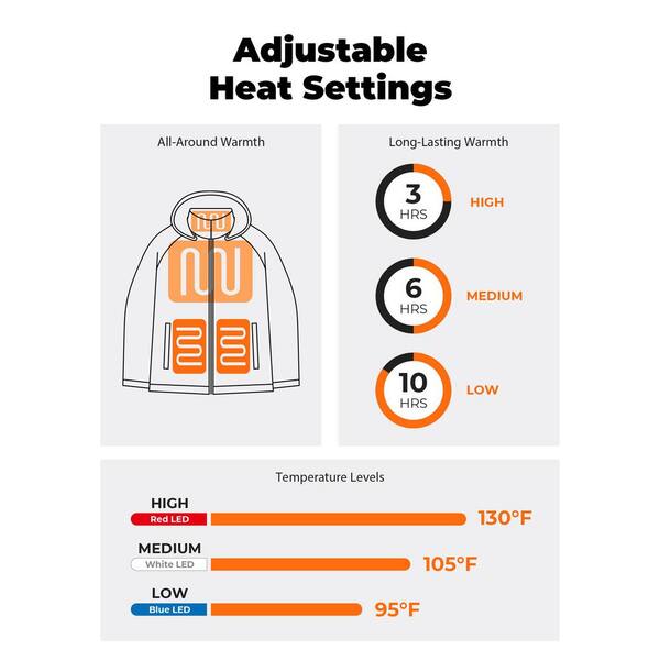 • Four heating zones (left & right pockets, upper back, collar)