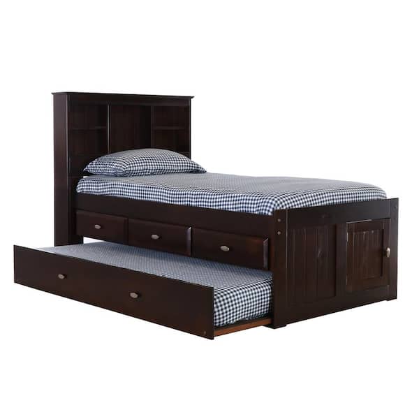 Mission Espresso Brown Twin Sized Captains Bookcase Bed with 3-Drawers and a Twin Trundle