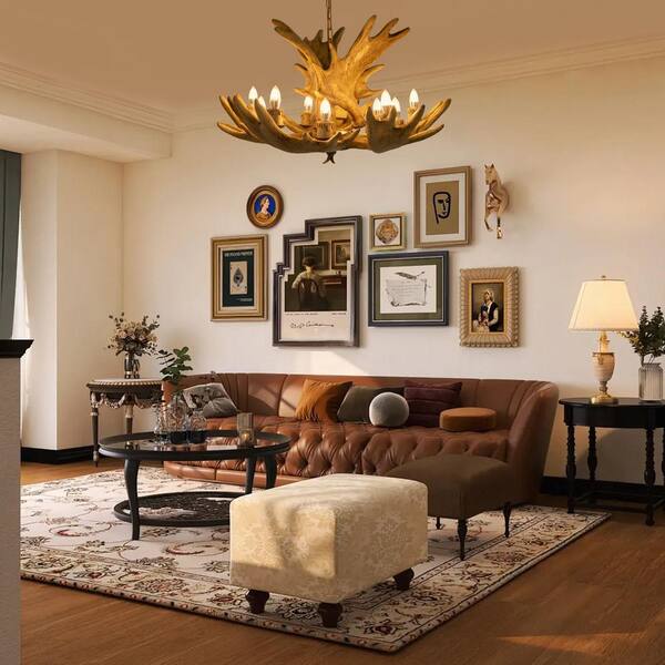 10-Light Brown Retro Deer Antler Chandelier for Living Room Kitchen Island with Adjustable Height, No Bulbs Included