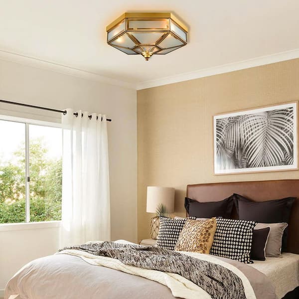 17.7 in. 4-Light Gold Vintage Hexagon Flush Mount Ceiling Light with Glass Shade for Bedroom, No Bulbs Included