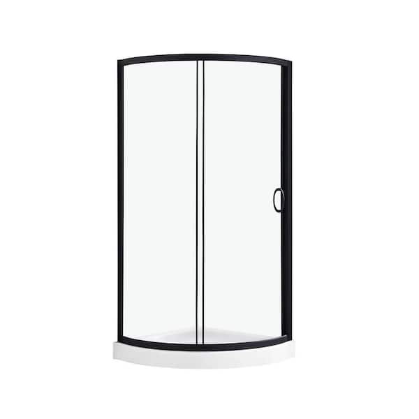 Breeze 34 in. L x 34 in. W x 76.97 in. H Corner Shower Kit with Clear Framed Sliding Door in Black and Shower Pan