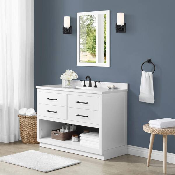 Rider 48 in. W x 22 in. D x 34 in. H Bath Vanity in White with White Engineered Stone Top and White Mirror