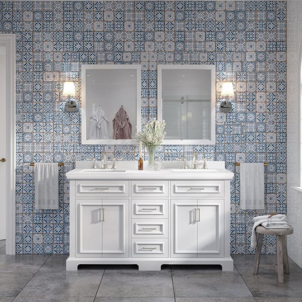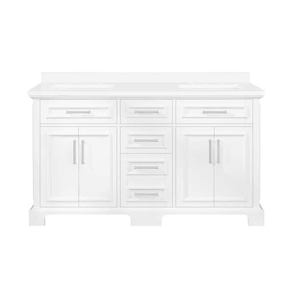 Sarah 60 in. W x 22 in. D x 35 in. H Double Sink Bath Vanity in White with White Engineered Stone Top