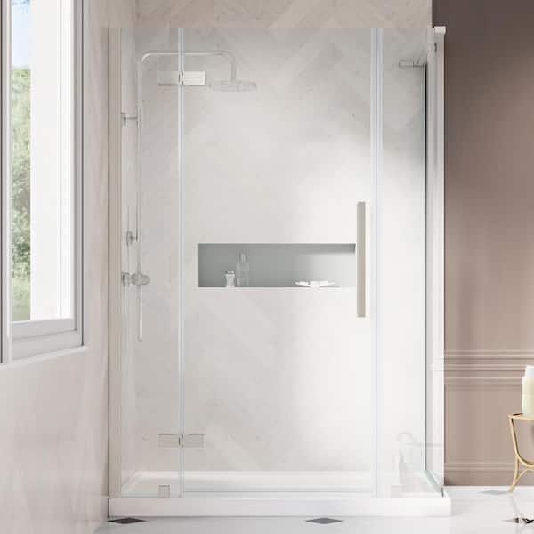 Tampa 48 in. L x 32 in. W x 75 in. H Corner Shower Kit w/ Pivot Frameless Shower Door in Satin Nickel and Shower Pan
