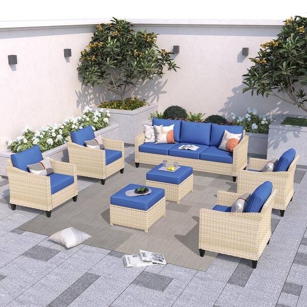 Athena Biege 7-Piece Wicker Outdoor Patio Conversation Seating Set with Navy Blue Cushions