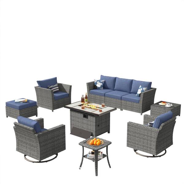 Bexley Gray 10-Piece Wicker Rectangle Fire Pit Patio Conversation Set with Denim Blue Cushions and Swivel Chairs