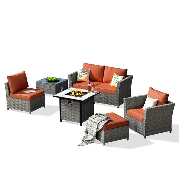 Bexley Gray 7-Piece Wicker Fire Pit Patio Conversation Seating Set with Orange Red Cushions