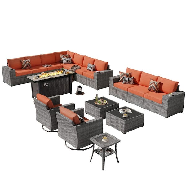 Bissty Gray 16-Piece Wicker Wide Arm Patio 54 in. Rectangle Fire Pit Conversation Set with Orange Red Cushions
