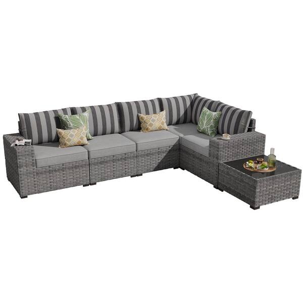 Bissty Gray 6-Piece Wicker Wide Arm Patio Conversation Set with Striped Gray Cushions