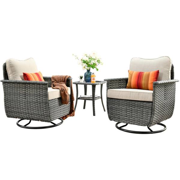 Fortune Dark Gray 3-Piece Wicker Outdoor Patio Conversation Set with Beige Cushions and Swivel Chairs