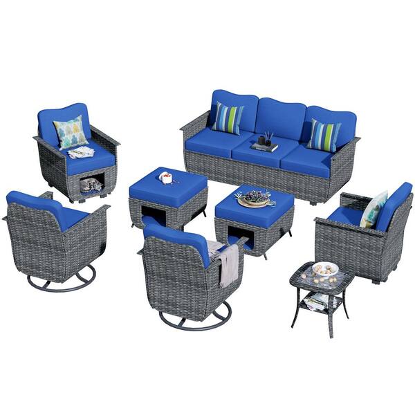 Fortune Dark Gray 8-Piece Wicker Outdoor Patio Conversation Set with Navy Blue Cushions and Swivel Chairs