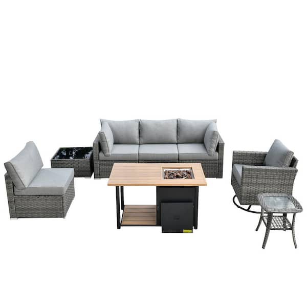 Hippish Gray 8-Piece Wicker Outdoor Patio Fire Pit Table Conversation Seating Set with Dark Gray Cushions