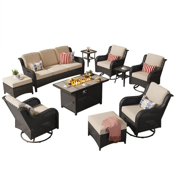 Joyoung Brown 10-Piece Wicker Patio Rectangle Fire Pit Conversation Set with Beige Cushions and Swivel Chairs